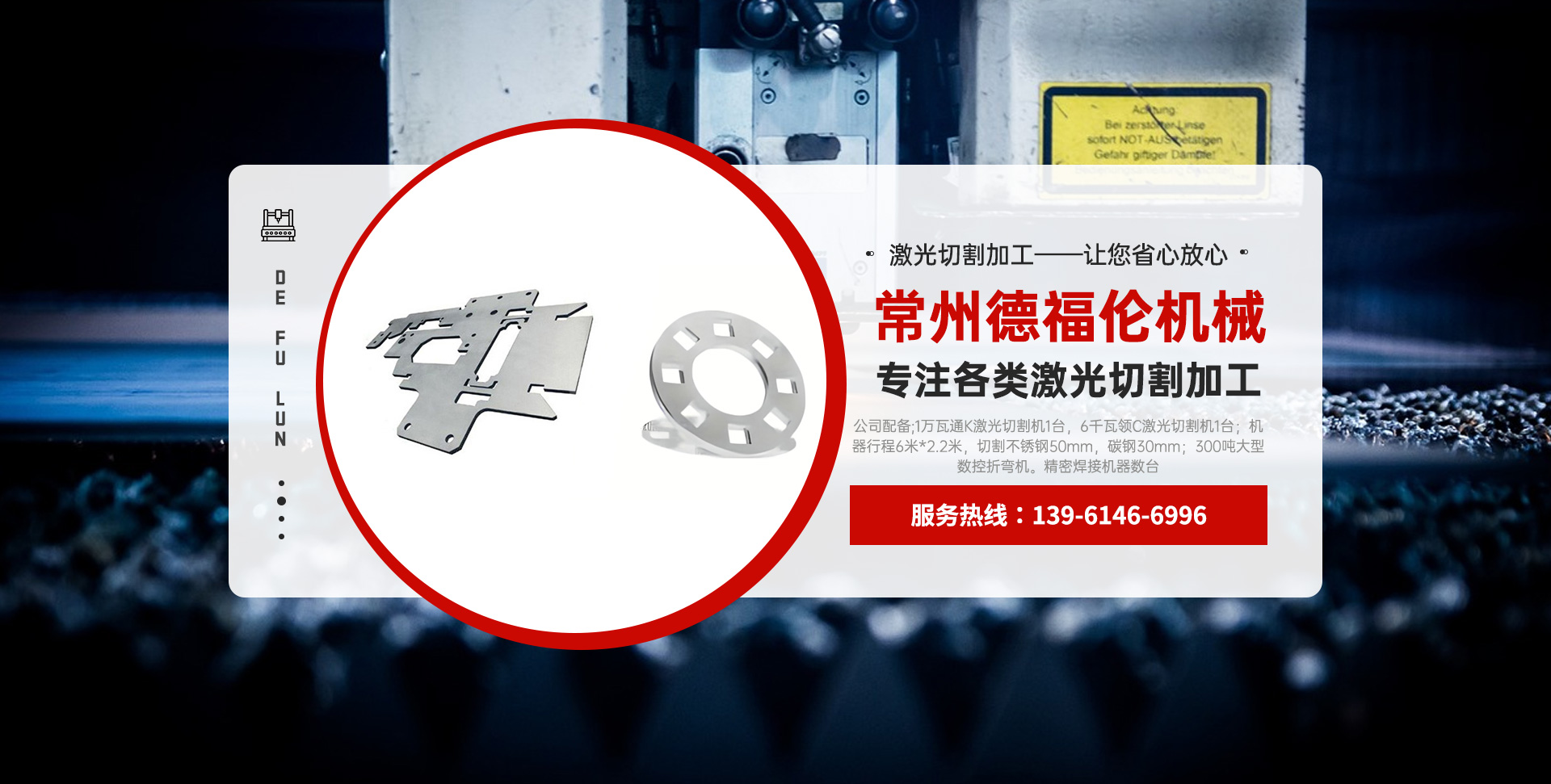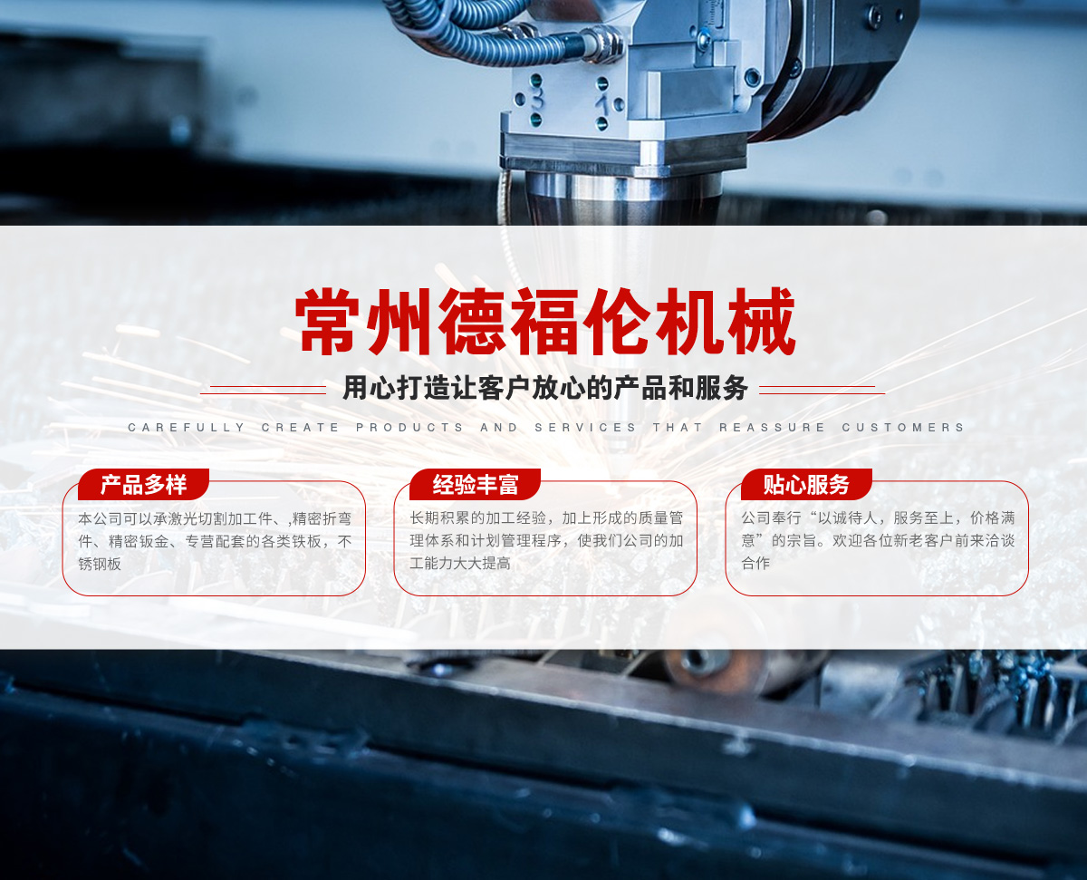 常州德福倫機(jī)械有限公司成立于2014年12月19號,位于江蘇省常州市武進(jìn)區(qū)遙觀鎮(zhèn)建農(nóng)村劍童路56號西門;公司配備;1萬瓦通K激光切割機(jī)1臺,6千瓦領(lǐng)C激光切割機(jī)1臺;機(jī)器行程6米*2.2米,切割不銹鋼50mm,碳鋼30mm;300噸大型數(shù)控折彎機(jī)。精密焊接機(jī)器數(shù)臺。本公司可以承激光切割加工件、,精密折彎件、精密鈑金、專營配套的各類鐵板,不銹鋼板。長期積累的加工經(jīng)驗(yàn),加上形成的質(zhì)量管理體系和計(jì)劃管理程序,使我們公司的加工能力大大提高,滿足客戶所需,是我們公司的目標(biāo)!公司奉行“以誠待人,服務(wù)為上,價(jià)格滿意”的宗旨。歡迎各位領(lǐng)導(dǎo);老總前來洽談合作!